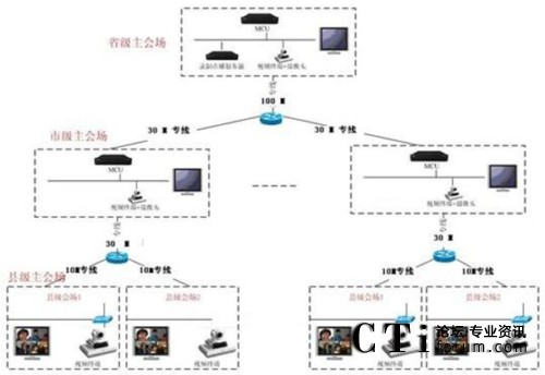 本方案整體采用基于IP網(wǎng)絡(luò),在省、市中心機(jī)房放置MCU,通過網(wǎng)線接入核心交換網(wǎng)絡(luò);在會(huì)議室放置視頻終端,通過郵政專網(wǎng)進(jìn)行互聯(lián)。一級(jí)系統(tǒng)以省中心會(huì)議室為主會(huì)場(chǎng),下屬各市會(huì)議室為分會(huì)場(chǎng)組成邏輯星形拓?fù)浣Y(jié)構(gòu);二級(jí)系統(tǒng)以市州郵政局會(huì)議室為主會(huì)場(chǎng),下屬各區(qū)縣郵政局會(huì)議室為分會(huì)場(chǎng)。兩級(jí)系統(tǒng)通過MCU級(jí)聯(lián)互通,形成一個(gè)樹形的拓?fù)浣Y(jié)構(gòu)。系統(tǒng)主要由全視頻會(huì)議管理系統(tǒng)、純硬件MCU、純硬件1080P高清會(huì)議終端等組成,采用MCU為中心的星形結(jié)構(gòu)建立一個(gè)數(shù)字連接的、專業(yè)的視頻會(huì)議系統(tǒng)。視頻會(huì)議系統(tǒng)可由省郵政廳視頻會(huì)議中心控制,任意切換參會(huì)市、州(分中心)、縣、市、區(qū)(終端)的會(huì)議畫面。視頻會(huì)議系統(tǒng)可以指定任意參會(huì)單位發(fā)言并實(shí)現(xiàn)全省會(huì)場(chǎng)統(tǒng)一的畫面切換。視頻會(huì)議系統(tǒng)可實(shí)現(xiàn)省郵政局集中控制與管理,易于使用,能進(jìn)行遠(yuǎn)程管理、遠(yuǎn)程維護(hù)、可降低維護(hù)成本。通過授權(quán),各級(jí)單位可自行組織、控制會(huì)議,方便各級(jí)單位的使用。