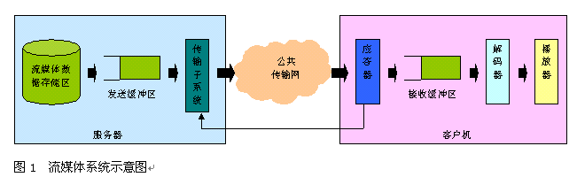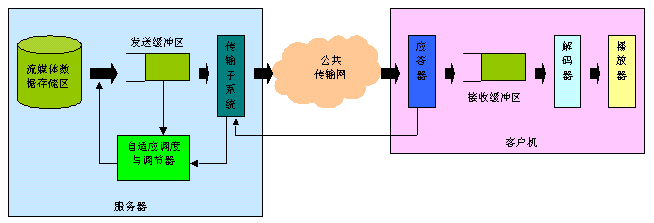 實(shí)時自適應(yīng)網(wǎng)絡(luò)帶寬的流媒體傳送技術(shù),是上海清鶴數(shù)碼科技公司的一項(xiàng)可大幅提高流媒體寬帶傳送過程中的關(guān)鍵服務(wù)質(zhì)量瓶頸的國際技術(shù)專利。我們知道,目前制約流媒體寬帶應(yīng)用發(fā)展的核心問題在于服務(wù)質(zhì)量。簡單地說,由于因特網(wǎng)的狀況是不可靠的,其帶寬、負(fù)荷等變化劇烈,這難以滿足流媒體寬帶業(yè)務(wù)的實(shí)時性服務(wù)質(zhì)量要求,并常常造成播放卡殼、延遲、視頻質(zhì)量抖動劇烈等不良情況,給使用者感官造成很大影響。所以解決好流媒體寬帶應(yīng)用的服務(wù)質(zhì)量問題對于流媒體寬帶應(yīng)用是極為重要的。如圖1所示,在一般的流媒體寬帶系統(tǒng)里,視頻服務(wù)器通過網(wǎng)絡(luò)向客戶機(jī)實(shí)時傳送流媒體信息。