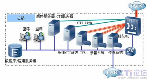 北京為總部中心,將部署CTI服務(wù)器、IVR服務(wù)器、錄音系統(tǒng)、傳真系統(tǒng)、文件服務(wù)器及相關(guān)業(yè)務(wù)數(shù)據(jù)庫服務(wù)器,為各個營業(yè)網(wǎng)點提供業(yè)務(wù)支撐?偛繉φ麄網(wǎng)絡(luò)進行管理,包括平臺配置、業(yè)務(wù)管理、數(shù)據(jù)管理、人員調(diào)度等。在總部CTI系統(tǒng)我們采用主備模式,確保了在出現(xiàn)網(wǎng)絡(luò)故障主CTI系統(tǒng)無法提供服務(wù)情況下,備用CTI系統(tǒng)將接替主CTI系統(tǒng)工作,確保了整個系統(tǒng)的正常工作。硬件平臺方面,UAP我們采用了雙主控板雙電源供電工作模式,這對系統(tǒng)長期穩(wěn)定工作提供了保障?偛客瑫r也部署北京農(nóng)村商業(yè)銀行300個坐席人員,這些坐席人員可以按照業(yè)務(wù)進行區(qū)分,大部分坐席精通一般的業(yè)務(wù),為普通客戶提供優(yōu)質(zhì)服務(wù),少部分坐席(專業(yè)坐席)人員為高價值客戶提供高級的專業(yè)的優(yōu)質(zhì)服務(wù),在普通坐席比較忙時,專業(yè)坐席可以為普通用戶提供服務(wù),坐席中,還有極少部分可以充當(dāng)坐席管理員角色,他們也可以監(jiān)控各個分中心坐席服務(wù)的質(zhì)量,對有問題服務(wù)可以實現(xiàn)監(jiān)聽、監(jiān)察、和強拆功能,及時的保證服務(wù)質(zhì)量,維護了企業(yè)形象。