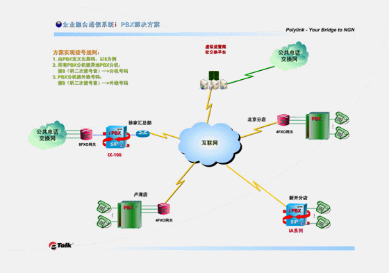 此方案實(shí)施后,用戶今后的VoIP分點(diǎn)擴(kuò)容會(huì)十分簡單易行。當(dāng)用戶有新的分店時(shí),分店的通訊系統(tǒng)可以直接上一臺(tái)Polylink eTalk® IA系列i PBX,它既有與PBX相同而且更多的各種功能,還具有VOIP網(wǎng)關(guān)的功能,可直接與總部的IX系統(tǒng)互相注冊(cè),既省掉了多添置一臺(tái)語音網(wǎng)關(guān)的成本,也避免了設(shè)備的重復(fù)堆壘。