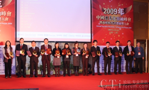 CTI論壇(ctiforum)12月15日消息(記者 張塵):12月10日,“2009中國(guó)信息化領(lǐng)袖峰會(huì)暨商用軟件評(píng)選頒獎(jiǎng)大會(huì)”在上海東錦江索菲特大酒店隆重召開(kāi)。此次會(huì)議以軟件行業(yè)協(xié)會(huì)為指導(dǎo)單位,由暢享網(wǎng)主辦,AMT集團(tuán)及德賽網(wǎng)協(xié)辦,并得到上海浦東軟件園的特別支持,通過(guò)歷時(shí)三個(gè)多月的調(diào)查研究和評(píng)選,結(jié)果于當(dāng)日揭曉。