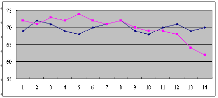 這是兩個座席員每天的通話利用率,橫軸是這個月從1號開始到14號,縱軸是通話利用率,藍色這位的平均通話利用率在70左右,粉紅色這位的平均通話利用率也是在70左右,但上下震蕩的很厲害,月初表現(xiàn)的很好,但從月中開始,通話利用率就一直明顯的下降。