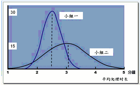 上面這張圖中,小組一的平均處理時長的標準差,顯然低于小組二,也就是小組一的座席員,大家處理時長差距都不大,都在2.5分鐘左右。