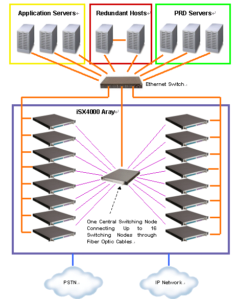 下圖顯示了一個大容量iSX4000 UAP系統(tǒng),該系統(tǒng)由兩臺互為冗余備份的主機(jī)、三臺應(yīng)用服務(wù)器、三臺PRD服務(wù)器和一個由16臺iSX4000交換機(jī)和一臺中央交換節(jié)點構(gòu)成的iSX4000陣列構(gòu)成。交換陣列的16臺iSX4000交換機(jī)通過光纖和中央交換節(jié)點連接。中央交換節(jié)點提供系統(tǒng)跨節(jié)點交換能力。系統(tǒng)可同時提供最多31744
