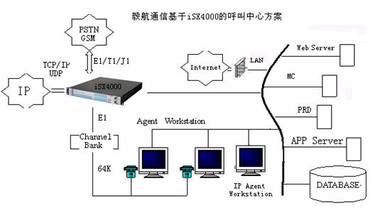 相對(duì)于現(xiàn)在的兩種主流呼叫中心方案,毅航通信基于iSX4000呼叫中心解決方案直接整合了Internet的接入。傳統(tǒng)由IVR完成的操作也可以通過Web頁面上的流程實(shí)現(xiàn),這樣用戶通過下拉菜單、簡單填寫、點(diǎn)擊按鈕等操作完成客戶識(shí)別、業(yè)務(wù)識(shí)別等操作,這些流程完成后,通過VoIP對(duì)呼叫中心呼入,由呼叫中心對(duì)呼入進(jìn)行受理,再按照相應(yīng)的原則分配到座席,座席再作相應(yīng)的應(yīng)答和處理,從而為客戶提供了一個(gè)通過Web站點(diǎn)直接進(jìn)入呼叫中心的途徑,把Internet所具有的豐富信息資源和強(qiáng)大的功能賦予呼叫中心,它向客戶提供一個(gè)可訪問的Web站點(diǎn),使得呼叫中心從“撥叫到交談(Dial to Talk)”發(fā)展到“點(diǎn)擊到交談(Click to Talk)”,通過Internet可以提供IP電話語音呼叫、Call Back、IP傳真、IM、E-mail等功能,擴(kuò)展了通信渠道,一方面用戶可以實(shí)現(xiàn)免費(fèi)接入到呼叫中心,另一方面企業(yè)能夠向更多的客戶提供優(yōu)質(zhì)、方便的服務(wù)資源,而且由于這些資源的價(jià)格相對(duì)傳統(tǒng)通信便宜,使企業(yè)為客戶提供全國、乃至于全球服務(wù)成為可能,提高了企業(yè)客戶服務(wù)水平,增強(qiáng)了企業(yè)競爭力。毅航通信統(tǒng)一呼叫中心解決方案系統(tǒng)結(jié)構(gòu)如圖所示: