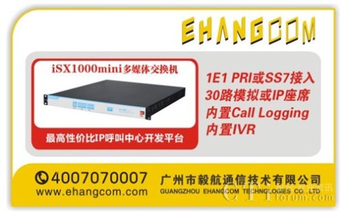 毅航通信為回饋社會各界朋友的關(guān)心與支持,加快中國中小企業(yè)呼叫中心產(chǎn)業(yè)化建設(shè),特推出作為最高性價(jià)比IP呼叫中心開發(fā)平臺的毅航iSX1000mini多媒體交換機(jī),1E1 PRI或SS7接入,30路模擬或IP座席,內(nèi)置IVR及Call Logging,價(jià)格優(yōu)惠。