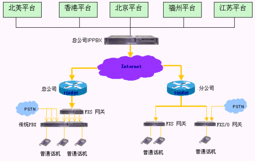 - 建設(shè)企業(yè)內(nèi)部的IP電話系統(tǒng),實現(xiàn)企業(yè)內(nèi)部各個分支結(jié)構(gòu)之間的免費通話,即總公司之間、各個分支機構(gòu)之間、總公司與各個分支機構(gòu)之間通訊免費。由于各地電話環(huán)境不同,各個分支機構(gòu)在使用內(nèi)部通話功能時候操作有些差異。