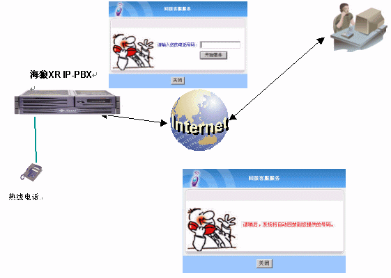 如圖:用戶在上網(wǎng)訪問企業(yè)網(wǎng)站的時候,如果需要和企業(yè)進行聯(lián)系,手邊沒有麥克風,就可以使用企業(yè)在網(wǎng)頁上的CALL-BACK800鏈接,點擊后就彈出一個窗口,然后輸入身邊的座機或者手機號碼,點擊開始服務(wù),窗口出現(xiàn)紅色的"請稍候,系統(tǒng)將自動回撥到您提供的號碼" ,稍等一會后,用戶的電話就會被呼叫,接通后就可以和企業(yè)的熱線電話進行溝通?梢詫崿F(xiàn)和WEB800同樣的效果,但是CALL-BACK800相對用戶來說是一個更方便的溝通方式。