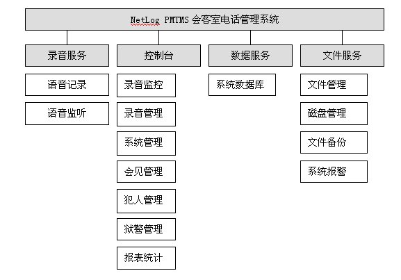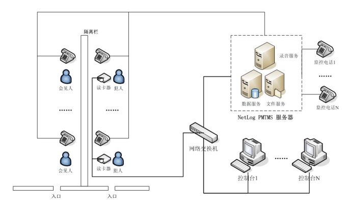 NetLog PMTMS會(huì)客室電話管理系統(tǒng)采用基于分布式、多層控制管理體系的設(shè)計(jì)思想,將電話線路與內(nèi)部網(wǎng)絡(luò)有效地結(jié)合在一起,形成一套完整管理系統(tǒng),包括會(huì)見監(jiān)控、通話錄音、數(shù)據(jù)管理。
