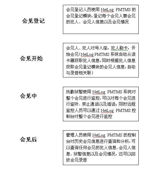 通過NetLog PMTMS系統(tǒng)的改善,整個(gè)會(huì)見流程變的高效和先進(jìn)。改善后的會(huì)見流程如下: