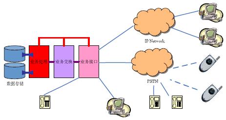 其中,業(yè)務(wù)接口部分為呼叫中心提供面向服務(wù)服務(wù)對象(客戶)的連接和面向服務(wù)者(座席)的連接接口,業(yè)務(wù)交換部分負(fù)責(zé)在請求服務(wù)的對象與提供服務(wù)提供者之間建立連接,業(yè)務(wù)處理部分負(fù)責(zé)對這些連接及服務(wù)內(nèi)容進(jìn)行管理和維護,數(shù)據(jù)存儲部分則為所有服務(wù)提供必要的數(shù)據(jù)資源和數(shù)據(jù)備份。