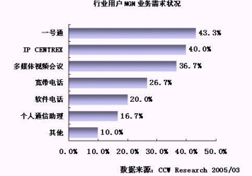 NGN 成為電信運(yùn)營(yíng)商滿足用戶需求的有力武器。不同的行業(yè)用戶對(duì)基于 NGN 推出的電信業(yè)務(wù)表現(xiàn)出了較大的需求差異,例如: IT通信、物流和服務(wù)業(yè)對(duì) IP CENTREX 、多媒體視頻會(huì)議和寬帶電話等業(yè)務(wù)比較感興趣,而政府用戶對(duì)一號(hào)通等業(yè)務(wù)比較感興趣。不同行業(yè)對(duì)業(yè)務(wù)需求具有差異性,這就要求運(yùn)營(yíng)商基于 NGN 平臺(tái)開(kāi)發(fā)的業(yè)務(wù)要有更大的靈活性,要有突出用戶通信需求的整體解決方案,要能滿足用戶的個(gè)性化需求。