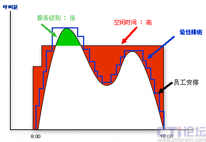 如果僅僅是工作量大,我想排班員還能夠忍受,更要命的是,排出的班表不能做到精確。要么人員太多,導(dǎo)致運(yùn)營(yíng)成本上升;要么人員不夠,無法達(dá)到預(yù)期的服務(wù)目標(biāo)。以呼叫中心典型的雙峰曲線為例(如右圖),排班所追求的是人力安排和話務(wù)曲線的盡可能吻合(也就是圖中藍(lán)色的最佳排班線),達(dá)到在滿足服務(wù)水平的基礎(chǔ)上盡可能少的安排座席資源。而在手工排班中,由于大量的采用組排班,組中成員同時(shí)上下班、同時(shí)午餐,導(dǎo)致人力安排的靈活性降低,不能盡可能的去擬合話務(wù)曲線。此外,參考前面談到的影響人力安排的因素,手工排班中考慮了環(huán)境的影響,部分考慮了縮減,但座席技能因素考慮很少,基本認(rèn)為所有人員的技能熟練度一致,不可預(yù)見性縮減也沒有考慮進(jìn)去,導(dǎo)致最終會(huì)對(duì)服務(wù)水平造成負(fù)面影響。因此,手工排班是一種粗放型的排班方式,隨著運(yùn)營(yíng)要求的提高,表現(xiàn)出一定的不適應(yīng)性。