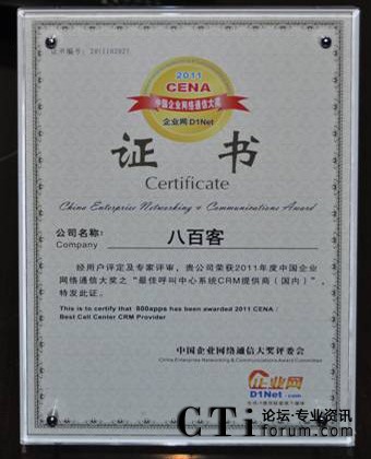 CTI論壇(ctiforum)10月31日消息(記者 張潔):10月19日,2011 秋季CENCE 中國企業(yè)網(wǎng)絡(luò)通信大會(huì)暨云計(jì)算高峰論壇在上海展覽中心盛大舉行。國內(nèi)首家SaaS廠商八百客憑借連續(xù)在云計(jì)算領(lǐng)域的成熟技術(shù)以及在市場中的廣泛認(rèn)可度,獲得“最佳呼叫中心系統(tǒng)CRM提供商”大獎(jiǎng)。
