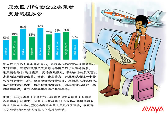 全球領(lǐng)先的企業(yè)通信軟件、系統(tǒng)和服務供應商Avaya公司(紐約證券交易所上市代碼:AV)近日公布了針對整個亞太地區(qū)關(guān)于遠程辦公的調(diào)查報告,結(jié)果表明,亞太地區(qū)70%的企業(yè)高層管理者支持員工遠程辦公,認為可以有效地提高員工的工作效率,進而提高企業(yè)的競爭優(yōu)勢。