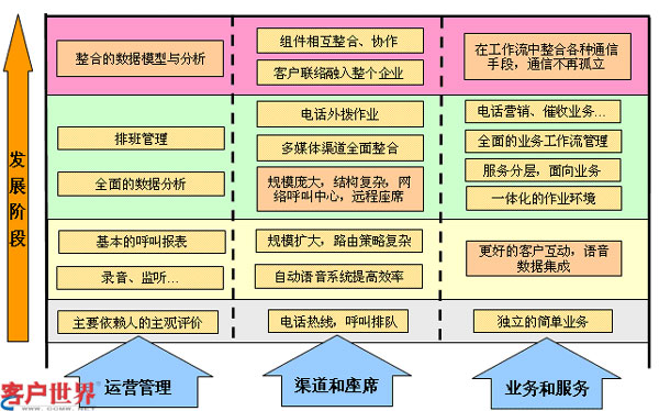 如圖一所示,國(guó)內(nèi)大多數(shù)企業(yè)呼叫中心基本經(jīng)歷了三個(gè)階段的發(fā)展,在呼叫中心建設(shè)初期,往往只是建設(shè)成電話熱線,座席人員接通電話,通過(guò)與客戶交流,利用簡(jiǎn)單獨(dú)立的呼叫中心應(yīng)用系統(tǒng),完成咨詢和接受訂單工作,在這階段對(duì)呼叫中心來(lái)講基本沒(méi)有什么管理,主要靠人的主觀評(píng)價(jià)來(lái)實(shí)現(xiàn)粗放運(yùn)營(yíng)。