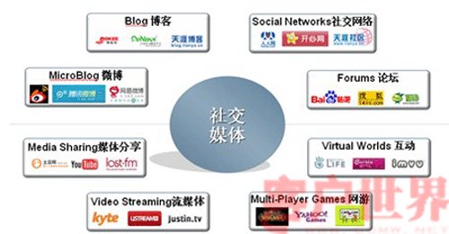 在國外這些網(wǎng)絡(luò)新媒體包括: SNS社交網(wǎng)絡(luò)(如FACEBOOK)、BLOGS博客、WIKI維基(WIKIEPEDIA\WIKITRAVEL、內(nèi)容分享(如圖片分享FLICKR\視頻分享YOUTUBE\社會標(biāo)簽DEL)、社區(qū)(包括傳統(tǒng)的BBS社區(qū)和新興的3D社區(qū)如第二人生等)和微博(如TWITTER)等。在國內(nèi)也涌現(xiàn)了一批社交媒體,如新浪、騰訊微博,天涯社區(qū)、開心網(wǎng)等。