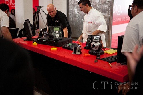 這個(gè)多層蛋糕在Avaya五月舉行的中小企業(yè)“大思維”市場(chǎng)活動(dòng)中登場(chǎng)亮相,它在一張可食用的長(zhǎng)會(huì)議桌上逼真呈現(xiàn)了工作中的Avaya電話、視頻會(huì)議解決方案和一套IP Office控制單元。 造型巧克力、谷類(lèi)食品、軟糖及其它烘焙材料同各種必要的Avaya通信組件結(jié)合在一起制作出的這個(gè)蛋糕被Buddy命名為“科技蛋糕”。 在完成由巧克力仿制電話所撥打的語(yǔ)音通話、并成功支持Buddy和Avaya高級(jí)副總裁兼全球通信解決方案總裁Alan Baratz博士之間的實(shí)時(shí)視頻會(huì)議之后,這個(gè)蛋糕作為甜點(diǎn)供全體活動(dòng)參加者享用。