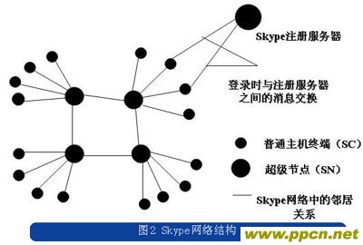 與常規(guī)的電信業(yè)務網(wǎng)絡不同的是,Skype的網(wǎng)絡中除了注冊服務器,沒有其他任何集中的服務器,只是將用戶節(jié)點分為普通節(jié)點和超級節(jié)點。Skype的系統(tǒng)連接結(jié)構(gòu)如圖2所示。