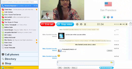 顯著的一個大改變是,軟件界面變成了全屏,而視頻窗口又占據(jù)了絕大部分版面。在視頻中還有“畫中畫”的功能,小的畫面可以任意移動。可以說skype從一部網(wǎng)絡電話,變成了一部網(wǎng)絡可視電話;蛘撸孟窀杏X是在視頻聊天室中一樣。