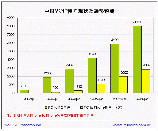 根據(jù)信息產(chǎn)業(yè)部的統(tǒng)計,2005年上半年IP通話時長(去話)達(dá)到644.1億分鐘,同比增長17.4%,據(jù)iResearch預(yù)測,2008年中國的PC to Phone的VoIP電話用戶將達(dá)到2800萬戶(如圖1)。2004-2005年,中國IP電話業(yè)務(wù)保持較高速度增長,但增長率已經(jīng)有所下降,因此中國IP電話業(yè)務(wù)處于擴(kuò)張期?梢灶A(yù)見IP電話業(yè)務(wù)仍將保持增長,但增長率將持續(xù)下降。中國VoIP市場的特點可以歸納為:使用VoIP技術(shù)的應(yīng)用環(huán)境正在逐步成熟,尚需要迎接質(zhì)量、網(wǎng)絡(luò)帶寬、安全等方面的挑戰(zhàn)。