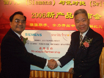 2006年3月29日的北京,還有些春風(fēng)料峭,但北京長富宮的芙蓉廳卻是暖意融融,德國通訊業(yè)巨擘西門子(Siemens)和美國企業(yè)通訊業(yè)新寵訊時(shí)捷(Switchvox)聯(lián)合舉辦VoIP新產(chǎn)品發(fā)布會,西門子終端通訊設(shè)備(上海)有限公司CEO
