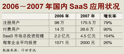 計(jì)世資訊《2007-2008年軟件運(yùn)營服務(wù)市場(chǎng)研究報(bào)告》數(shù)據(jù)顯示,2007年管理型SaaS應(yīng)用市場(chǎng)規(guī)模為4.5億元人民幣,付費(fèi)企業(yè)用戶數(shù)為26萬,企業(yè)年平均消費(fèi)水平僅為2000元/年,其中近八成用戶年平均消費(fèi)低于2000元。目前國內(nèi)SaaS的用戶群仍以中小企業(yè)用戶為主,不過SaaS提供商Saleforce的加入有望改變這一現(xiàn)狀。