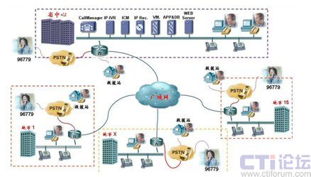 如上圖所示,由于Cisco IPCC是基于標(biāo)準(zhǔn)IP網(wǎng)絡(luò)的純IP呼叫中心解決方案,呼叫中心的核心設(shè)備都只部署在省中心機(jī)房,其它地市只需要在原有網(wǎng)絡(luò)的路由器上添加語音模塊即可實(shí)現(xiàn)PSTN語音的本地接入,而無需再各地市購買額外的接入設(shè)備。而同樣由于IP網(wǎng)絡(luò)的特性,呼叫中心的坐席可以根據(jù)需要部署在甘肅省運(yùn)輸管理局IP網(wǎng)絡(luò)可達(dá)的任何一個地方,各地市的坐席只需要配備IP電話和座席PC即可。來自PSTN的電話根據(jù)用戶在IVR中的選擇和其它路由策略,自動分配到最適合的坐席處理,譬如來自白銀的運(yùn)政投訴由白銀市本地的運(yùn)政大廳座席人員處理。