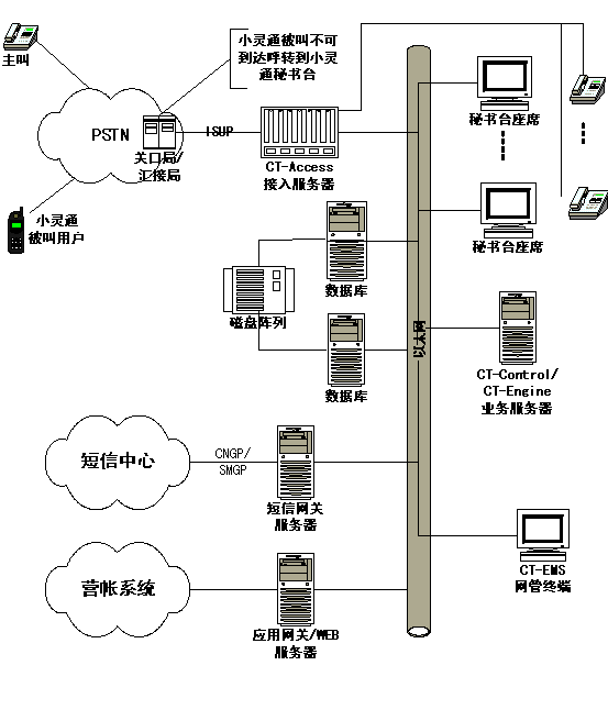如上圖所示,小靈通秘書臺網(wǎng)絡(luò)拓?fù)鋱D,上圖中紅色虛線的左邊為運(yùn)營商部分,紅線是接口部分, 紅色虛線的右邊是增加的小靈通秘書臺設(shè)備和工程實施部分。首先需要在小靈通網(wǎng)絡(luò)的關(guān)口局或者匯接局設(shè)置被叫不可到達(dá)(關(guān)機(jī)、忙、不在服務(wù)區(qū))呼叫前轉(zhuǎn),通過ISUP協(xié)議呼叫到小靈通秘書臺的CT-Access接入服務(wù)器,提取主叫號碼、被叫號碼、原被叫號碼,同時給主叫播放語音,"您撥的用戶無法接通,您可以選擇失話復(fù)得業(yè)務(wù),本業(yè)務(wù)每條短信收費0.1元,漏話提示請按1號鍵,短信回叫請按2號鍵,轉(zhuǎn)人工請按9號鍵"。然后根據(jù)主叫的響應(yīng)選擇提供服務(wù)(業(yè)務(wù)流程見第3章)。小靈通秘書臺的業(yè)務(wù)部分由CT-Control/CT-Engine業(yè)務(wù)服務(wù)器和數(shù)據(jù)庫服務(wù)器組成,另外包括人工臺和短信網(wǎng)關(guān),短信網(wǎng)關(guān)通過CNGP(網(wǎng)通)、SMGP(電信)和短信中心網(wǎng)關(guān)接口,實現(xiàn)短信發(fā)送功能。業(yè)務(wù)網(wǎng)關(guān)和WEB服務(wù)器為可選部分,根據(jù)業(yè)務(wù)需要選配。