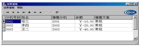 催繳調(diào)度表中的%欠費(fèi)%,用戶可以從計(jì)費(fèi)系統(tǒng)的月報(bào)表中提出(用戶輸入月份,自動(dòng)根據(jù)催繳電話取過(guò)來(lái));也可由用戶再次修改(針對(duì)所欠不是一個(gè)月的費(fèi)用),但“刷新”又從從計(jì)費(fèi)系統(tǒng)的月報(bào)表中更新數(shù)據(jù)。