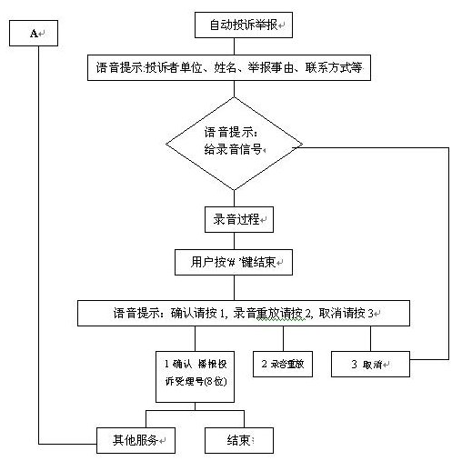 群眾通過自動臺按照語音提示進(jìn)行投訴、舉報選擇錄音。自動投訴舉報錄音流程如下: