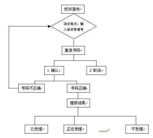 通過自動臺,輸入自己的投訴序號查詢投訴處理結(jié)果,自動投訴處理結(jié)果查詢流程如下: