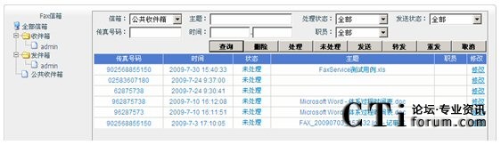 打開瀏覽器,輸入WebFax管理網(wǎng)站的地址,登陸,然后通過這個(gè)網(wǎng)站,查看收發(fā)傳真的狀態(tài),及接收傳真的圖像?梢赃M(jìn)行查詢、下載、發(fā)送、轉(zhuǎn)發(fā)、重發(fā)和刪除傳真。