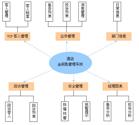 酒店金鑰匙管理系統(tǒng)通過客房電話與客人管理信息系統(tǒng)的結(jié)合,實(shí)現(xiàn)了酒店對在住客人服務(wù)事務(wù)的管理,最大限度地提高了酒店的服務(wù)效率、滿足客人的服務(wù)需求。系統(tǒng)包括VIP客人管理、業(yè)務(wù)管理、部門管理、回訪管理、安全管理、經(jīng)理圖表六大功能模塊,體系結(jié)構(gòu)如下: