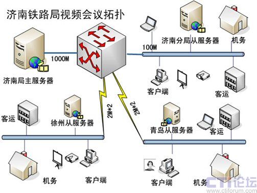 由于路局改革后組織結(jié)構(gòu)的特點,決定了跨地域會議較多,如濟南和徐州、青島之間召開的部門級別的會議比較頻繁,加上三地之間的帶寬制約,本方案建議采用主從服務(wù)器的系統(tǒng)架構(gòu),1主3從,主服務(wù)器設(shè)置在路局網(wǎng)絡(luò)中心,原來濟南分局位置設(shè)置1臺從服務(wù)器,負責濟南地區(qū)的內(nèi)部會議,以及與其他2地的遠程會議,同樣徐州、青島也各設(shè)置1臺從服務(wù)器。