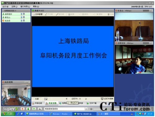 CTI論壇(ctiforum)08月06日消息: 日前,京九干線主力機務(wù)段——上海鐵路局阜陽機務(wù)段成功啟動視維Super-V視頻會議系統(tǒng)。阜陽機務(wù)段的領(lǐng)導(dǎo)和職工,每天早上8點上班后,第一件事情就是登陸視頻會議系統(tǒng),匯報前日工作情況、部署當(dāng)日工作內(nèi)容。已然,山大聯(lián)潤為上海路局阜陽機務(wù)段部署的阜陽機務(wù)段視頻會議系統(tǒng),成為鐵路部門必不可少的遠(yuǎn)程溝通交流工具,在有效提高鐵路系統(tǒng)溝通效率的同時,保障了鐵路運輸?shù)陌踩,極大滿足了鐵路部門暑期運營業(yè)務(wù)對溝通和會議的需求。