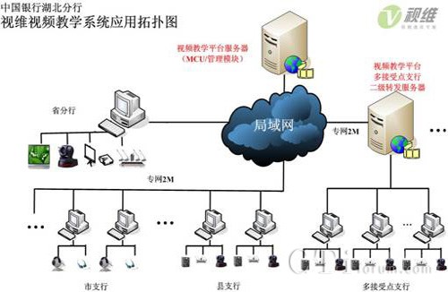 中國銀行湖北分行的視頻教學系統(tǒng)由服務器端和客戶端組成,服務器端軟件部署在省分行中心機房,配置2臺服務器,對于接受點超過5個的分支機構配置二級轉發(fā)服務器,共支持全省各支行及支行內多個客戶端同時在線,負責所有培訓的召集、音視頻交互、加密等工作,各支行通過WEB方式即可實現(xiàn)客戶端軟件的自動安裝與升級,輕松實現(xiàn)實現(xiàn)省分行以及各支行共77余個接受點的高清音視頻視頻教學。同時為中國銀行湖北分行的視頻教學系統(tǒng)配置異構兼容模塊,支持與其他視頻會議及軟、硬件視頻教學系統(tǒng)無縫融合,避免重復投資造成的浪費。網(wǎng)絡拓撲圖如下: