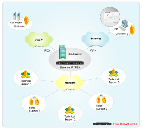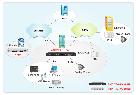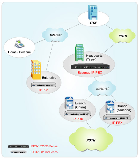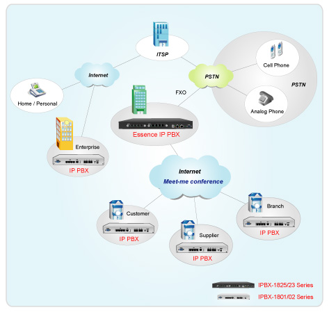 Essence IPBX系列可以注冊者之形式注冊于其他SIP協(xié)定伺服器上,如ITSP運(yùn)營平臺,或是分公司之小型IP PBX注冊至總公司之大型IP PBX ,均可透過Internet 將話務(wù)無限延伸。
