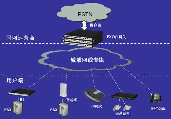 “固網(wǎng)IP化”方案無需軟交換,延用現(xiàn)有的數(shù)字程控交換機(jī)與業(yè)務(wù)支持系統(tǒng)作為核心網(wǎng)業(yè)務(wù)平臺,只是在交換機(jī)外圍增加實(shí)現(xiàn)模擬/數(shù)字語音信號轉(zhuǎn)換成IP的VoIP網(wǎng)關(guān),并通過IP網(wǎng)絡(luò)實(shí)現(xiàn)與遠(yuǎn)程客戶終端設(shè)備的連接。遠(yuǎn)程的用戶端設(shè)備可以是傳統(tǒng)設(shè)備,如普通電話、傳真機(jī)或小型交換機(jī),也可以是基于IP的語音設(shè)備,如SIP電話、IPPBX等(如下圖所示)。可以實(shí)現(xiàn)小區(qū)放號、企業(yè)直線電話、企業(yè)語音交換機(jī)接入等業(yè)務(wù)。