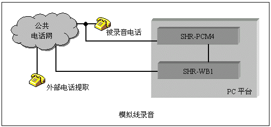 三匯公司的SHR系列監(jiān)控錄音卡可以實現(xiàn)對電話線路或其它信號源如話筒信號、對講機等進行錄音。模擬線錄音采用高阻抗并線的方式,對被錄音對象無影響。可以檢測電話線上直流電壓、DTMF號碼、FSK/DTMF CallerId等信號。采用配套的高阻復(fù)接盒,SHD系列數(shù)字中繼卡還能完成對數(shù)字中繼線的監(jiān)控錄音,并能分析線路上的信令,從而取得通話狀態(tài)和主被叫號碼。這兩種錄音系統(tǒng)的結(jié)構(gòu)如下圖: