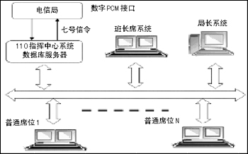 系統(tǒng)由以下部分組成:CTI服務(wù)器、接警席位系統(tǒng)、班長席位系統(tǒng)、局長席位系統(tǒng)。各部分系統(tǒng)可根據(jù)實(shí)際需求任意組合,各個部分充分考慮到開發(fā)的實(shí)用性、可靠性、先進(jìn)性和開放性,能夠?qū)④浖S護(hù)降到最小程度,這樣的設(shè)計可以讓用戶能夠改動硬件和數(shù)據(jù)庫,卻不用將軟件整體更換,保證了用戶的投資。其結(jié)構(gòu)如圖2所示。
