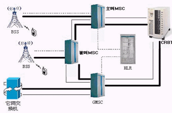 移動網(wǎng)絡(luò)CRBT解決方案主要由網(wǎng)關(guān)移動業(yè)務(wù)交換中心(GMSC),移動業(yè)務(wù)交換中心(MSC),歸屬位置寄存器(HLR),CRBT平臺等部分組成,其中需要使用GMSC實現(xiàn)與它網(wǎng)交換機(jī)進(jìn)行互聯(lián),網(wǎng)絡(luò)拓?fù)鋱D如下: