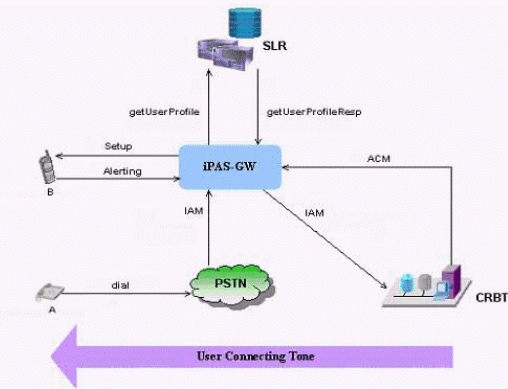 以UT斯達(dá)康的iPAS網(wǎng)絡(luò)為例進(jìn)行說明,被叫端局的iPAS-GW 可根據(jù)用戶的屬性決定用戶是否訂閱CRBT業(yè)務(wù),如果被叫用戶訂閱了該項業(yè)務(wù),則 iPAS-GW 將呼叫轉(zhuǎn)到CRBT平臺,由該平臺在被叫號碼前加撥特殊前綴后繼續(xù)向iPAS-GW發(fā)起新的呼叫,同時根據(jù)主叫號碼所選擇個性化鈴聲向主叫用戶放音,而iPAS-GW則直接接續(xù)被叫小靈通用戶,當(dāng)被叫用戶摘機(jī)后,CRBT平臺負(fù)責(zé)將主、被叫接通,也就是說在通話過程中始終要占用CRBT平臺的話路資源和 iPAS-GW 的中繼資源。如下圖所示: