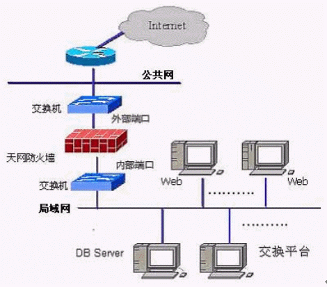 對整個系統(tǒng)網(wǎng)絡(luò)的保護(hù)首先要從保護(hù)內(nèi)部網(wǎng)絡(luò)避免受到Internet網(wǎng)上的攻擊為主,可以采用高可靠性的防火墻作為主要手段,網(wǎng)絡(luò)拓?fù)鋱D如下圖所示:
