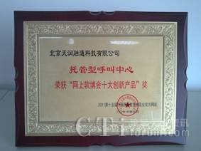 為了樹立軟件行業(yè)創(chuàng)新業(yè)務(wù)的典范,分享不同企業(yè)的軟件發(fā)展成果,本次大會(huì)通過官網(wǎng)的產(chǎn)品展示,用戶體驗(yàn)投票和軟博會(huì)專家顧問團(tuán)評(píng)選的方式,評(píng)選出了的“軟博會(huì)十大創(chuàng)新產(chǎn)品”獎(jiǎng)。北京天潤(rùn)融通科技有限公司的“托管型呼叫中心服務(wù)”,以其在呼叫中心鄰域內(nèi)創(chuàng)新的saas業(yè)務(wù)模式,簡(jiǎn)單、易用、可依靠的服務(wù)特色,獲此殊榮。