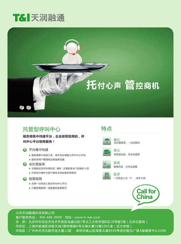 北京天潤(rùn)融通科技有限公司致力于為企業(yè)提供簡(jiǎn)單、易用、可依靠的托管型呼叫中心服務(wù),幫助企業(yè)更好地經(jīng)營(yíng)其客戶資源。天潤(rùn)融通是國(guó)內(nèi)呼叫中心領(lǐng)域內(nèi)領(lǐng)先的“云應(yīng)用”提供者。先后承接了百度全國(guó)客服中心、平安保險(xiǎn)北京客服中心、慧聰網(wǎng)呼叫中心、央視網(wǎng)絡(luò)客服中心、安博教育客服中心、圓通快遞客戶服務(wù)中心、飯統(tǒng)網(wǎng)客戶訂餐中心等大型的呼叫中心項(xiàng)目。服務(wù)的客戶遍及互聯(lián)網(wǎng)、教育培訓(xùn)、金融服務(wù)、旅游票務(wù)、電子商務(wù)、食品飲料、醫(yī)療保健、消費(fèi)品制造和銷售、物流、餐飲娛樂(lè)、電視購(gòu)物等十多個(gè)領(lǐng)域達(dá)數(shù)千家企業(yè)客戶。