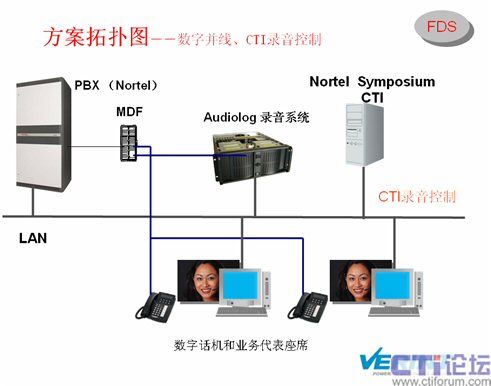 Audiolog錄音系統(tǒng)能和Nortel交換機(jī)、Symposium CTI進(jìn)行整合,獲取CTI隨路數(shù)據(jù)便于用戶(hù)錄音資料檢索。