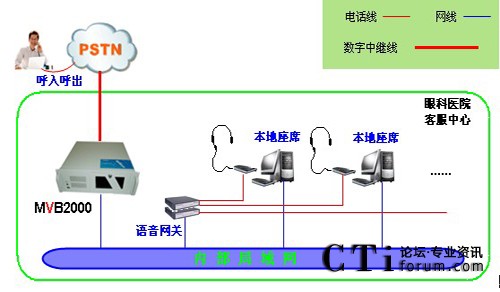 醫(yī)院采用暢信達(dá)通信MVB2000系統(tǒng)作為交換平臺,采用1路E1數(shù)字中繼線接入,對外公布統(tǒng)一的外線呼入號碼,采用語音網(wǎng)關(guān)結(jié)合話機(jī)作為座席終端,前期投入8位人工座席,系統(tǒng)架構(gòu)形式如下: