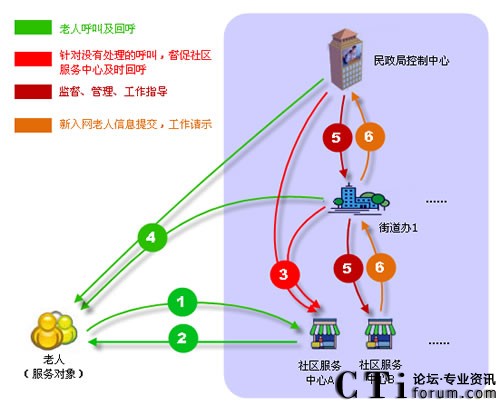 社區(qū)呼叫平臺包含:老人、民政局、街道辦、社區(qū)服務(wù)中心四個(gè)業(yè)務(wù)角色,民政局、街道辦、社區(qū)服務(wù)中心通過專用網(wǎng)絡(luò)建立高效聯(lián)動機(jī)制。