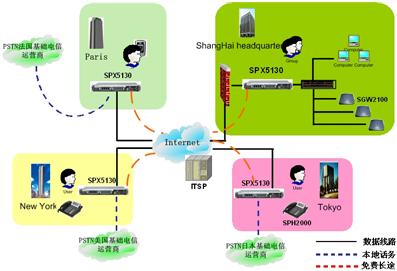 隨著公司在全世界開設(shè)眾多的部門,IP電話技術(shù)將會(huì)是不同分公司之間實(shí)現(xiàn)低費(fèi)用高品質(zhì)語(yǔ)音通訊的方式。SINOCO公司的IP-PBX 系統(tǒng)解決方案,利用 SPX-5130設(shè)備通過(guò)互連網(wǎng)連接到公司的各個(gè)分支機(jī)構(gòu),提供分級(jí)體系結(jié)構(gòu),更進(jìn)一步提供了可靠的,靈活的語(yǔ)音通訊解決方案,從而滿足公司快速回應(yīng)客戶的需求。同時(shí),它也降低了總部和分部之間的電話費(fèi)用?偛亢头植块g昂貴的國(guó)際電話費(fèi)用將不再存在, 而且享受高品質(zhì)的語(yǔ)音通訊質(zhì)量。